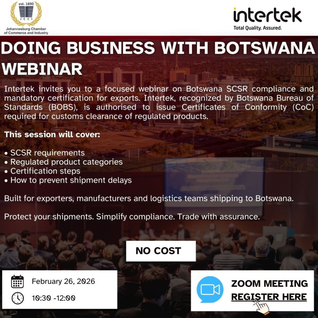 DOING BUSINESS WITH BOTSWANA By JCCI AdminFebruary 26, 2026 When February 26, 2026 10:30 am - 12:00 pm Add To Calendar Download ICS Google Calendar iCalendar Office 365 Outlook Live Event Type Events Upcoming Events Share