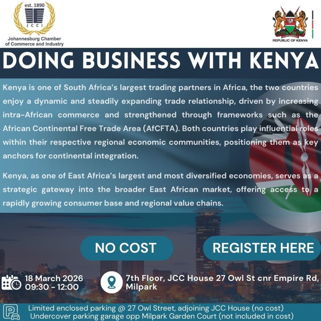 DOING BUSINESS WITH KENYA By JCCI AdminMarch 18, 2026 When March 18, 2026 9:30 am - 12:00 pm Add To Calendar Download ICS Google Calendar iCalendar Office 365 Outlook Live Event Type Events Upcoming Events Share