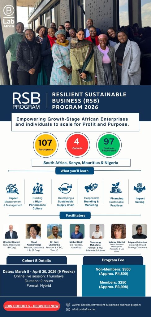 As part of our commitment to strengthening business resilience and inclusive growth across Johannesburg, the Johannesburg Chamber of Commerce and Industry (JCCI) proudly partners with B Lab Africa to bring the Resilient Sustainable Business (RSB) Program to our members, equipping your organisation to scale with resilience and purpose, building long-term competitiveness while contributing to an economy that benefits people, communities, and the planet.